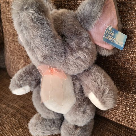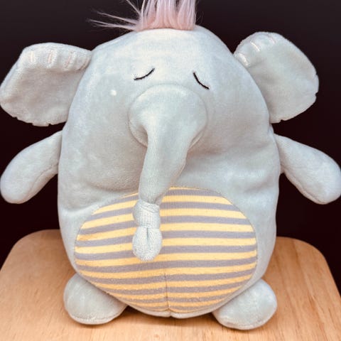Norsu pehmolelu, vähän aurinko haalistanut värejä, kun on ollut ikkunalla koristeena