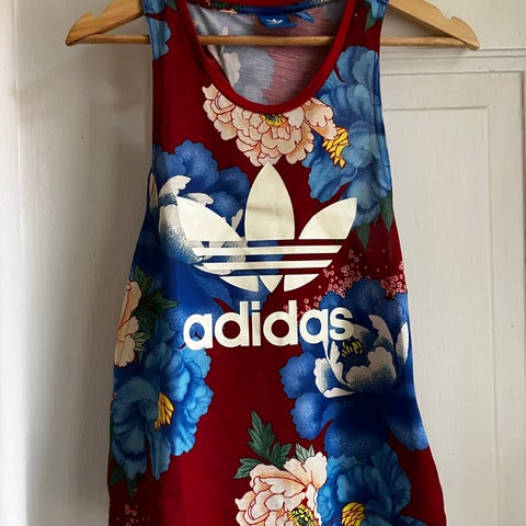 Musta Adidaksen toppi, takana lukee pinkillä Adidas. Väljä malli, erittäin kevyttä kangasta, mukava päällä. Koko S.