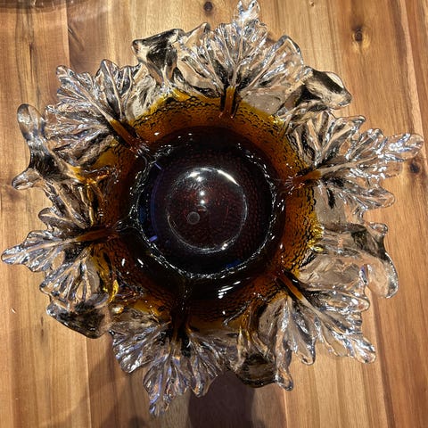 Kasvimaalla lasikulho. Ruskea. Halk. n. 33 cm, kork.11 cm. Virheetön. Humppilan lasi.
