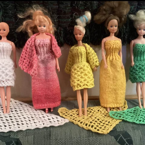 Neulekoneella neulottuja Barbien vaatteita. Käyttämättömiä. Nämä taatusti kestävät.