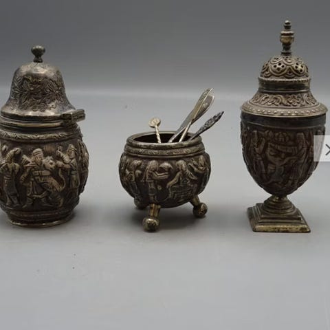 - pieni , metallia, hopeaa?, ei leimoja, kullanvärinen sisus, korkeus 2 cm, halkaisija noin 3,5 cm, hinta 15 MYYTY