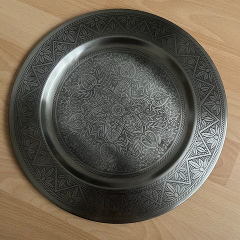 Pieni kiiltävä metallinen koristelautanen, halkaisija 10 cm. Siistikuntoinen.