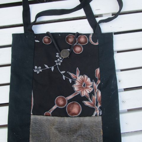 Musta laukku metallisomistein ja nahkatehostein. Sivuilla nepparitaskut ja iso tasku vetoketjulla. Sisällä pieni vetoketjutasku. Kangasvuori. Siisti, ehjä ja hyväkuntoinen.