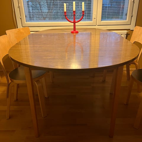 Tarjoa hintaa! Ruskea näyttävä uudenveroinen antiikkityylinen/biedermayer ruokapöytä jatkopalalla. Kätevästi muokattavissa isommaksi esim. juhliin. Kokopuuta, koristeellinen jalka, joka keskellä, jolloin ei häiritse istumista ja tuolien sijoittamista. Sallii monentyyliset ruokatuolit. Ostettu Tyylikaluste Lappalainen Oy:lta Lahdesta. Ovh noin 2000€. Mitat 106cmx106cm, jatkopala lisäksi 39cm. Korkeus 77,5cm.