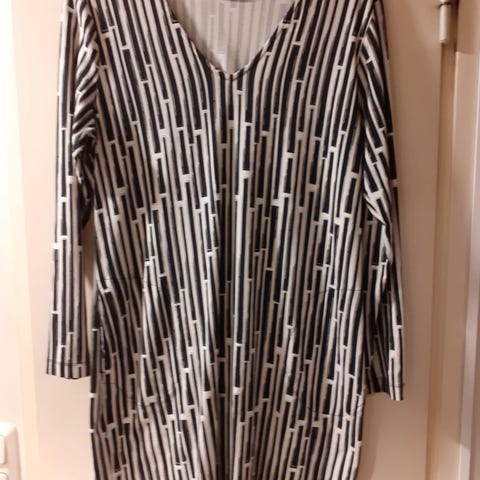 Me&I -merkkinen tunika kokoa L. Joustava materiaali. Mittoja: k-k 50 cm, o-h 85 cm. Väri ruskea, vasemmassa helmassa medaljongikuvio. Kiinteät nauhat vyötäröllä. Vähän pidetty, hyväkuntoinen. Hp: 8 e.