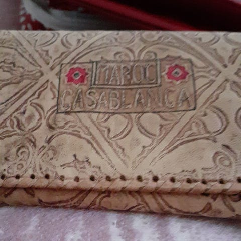 Matkamuisto lompakko Egyptistä. Päällinen aitoa nahkaa. Mitat n. 11 x 17 cm.