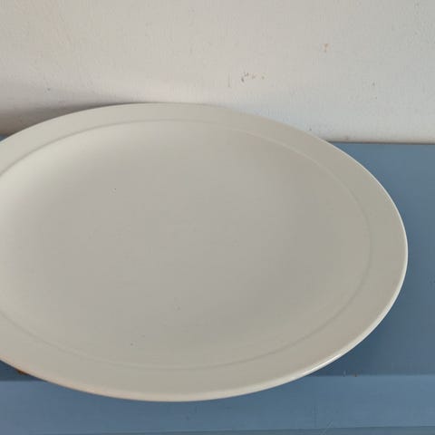 Design Inkeri Leivo, tuotannossa 1988-97. Myynnissä 1 kpl iso lautanen / tarjoiluvati, jonka halkaisija on 33 cm. Lautanen on täysin ehjä ja oikein hyväkuntoinen, mutta kuitenkin jonkin verran käytössä ollut ja sen lasitehdas on hieman kulumajälkeä (ks. viimeinen kuva).