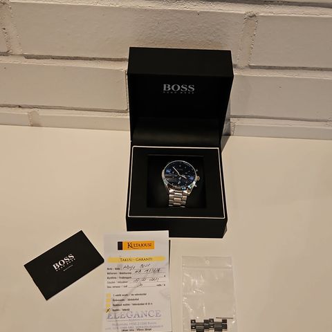 Bossin upea naisten kello ajanottotoiminnolla. Kellotaulu musta. Mukana alkuperäinen laatikko ja rannekkeen jatkopalat.