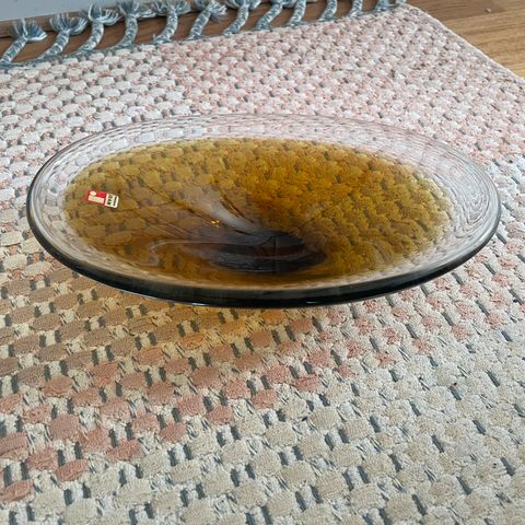 Lasinen tarjouluastia, halkaisija34 cm. Numeroitu 1394/2000. Marttaliitto 90 v.1899-1989. Nuutajärven tarra.