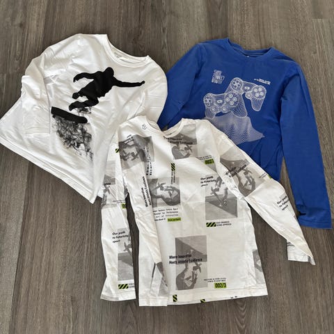 Hyvässä kunnossa olevat T-paidat koossa 146/152 cm. Vihreä lyhyempi malli, raidallisessa olkapäät näkyvät.