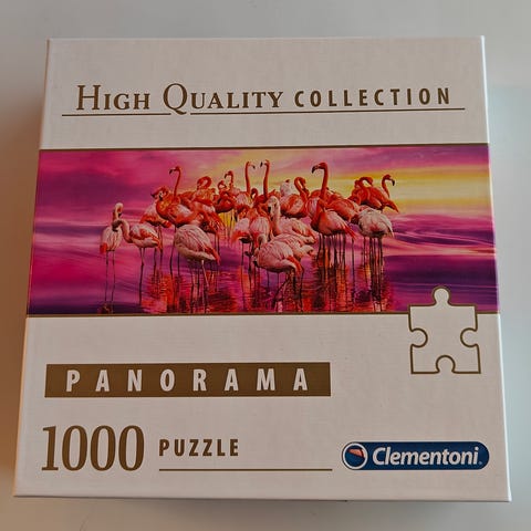 Upea panorama palapeli jossa flamingoja auringonlaskussa. Todella kauniit värit vaaleanpunaista, keltaista, oranssia ja lilaa. Sopivasti haastetta. Clementoni high quality puzzle Flamingo Dance. Koko 98 x 33 cm. Laatikon koko 40 x 21 x 6,3 cm. Palat pussitettu. Kannen kuvan reunaan on pienin kuulakärkikynämerkinnöin jaettu kuvan kokoa.