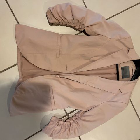 Musta kiiltävää materiaalia oleva bleiseri, Gina Tricot. Olkapäillä pienet toppaukset. Koko 34 / XS. Mitat: kainalo-helma 36cm, hihan pituus kainalosta 49cm.