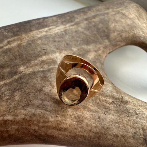 Granitin hopeasormus tummalla savukvartsilla. Koko 16,5 mutta kapeneva rengas antaa vähän väljyyttä. Kiven alla olevassa tilassa aavistuksen helisee/kierii jotakin, ilmeisesti tarkoituksella. Kiven yläviisteessä on nirhauma, ks. kuvat.