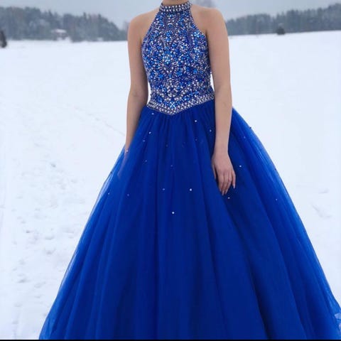 Myydään kaunis, sininen vanhojen tanssimekko (+pukupussi). Ostettu iltapuku Outletista 2023, yhdet vanhat tanssittu. Setin ovh 220€.