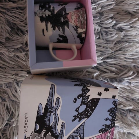 Uudet käyttämättömät tarralliset ja lapulliset muumimukit