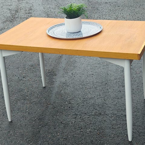 Upea ja näyttävä ruokapöytä 50-luvulta. Aitoa massiivitammea, 2x 40cm jatkopalat. Mitat Pit. 140-220cm x Lev.90cm x Kork.75cm.