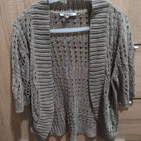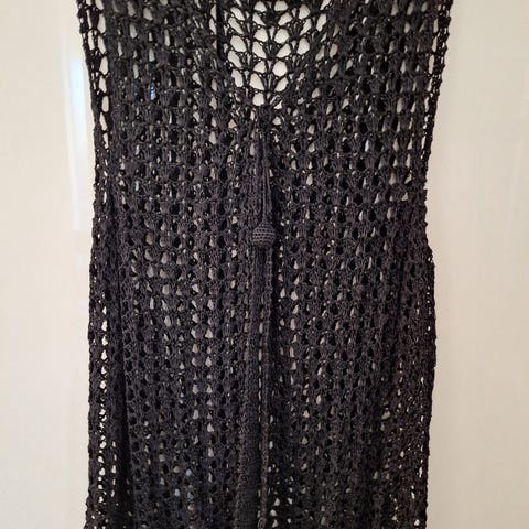 Vihreä edestä auki oleva, käsin neulottu liivi, holkkihihat (ei nappeja). Novitan puuvillalankaa. Liivin pituus 85 cm, leveys kainalon alta 85 cm ja helmasta 100 cm.