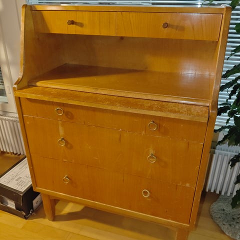 Tasoihin upotettu lasilevyt. Todella painava, massiivipuuta. Ovien lukkoihin ei ole avainta. Peilin takana kyltti "ASM MASSOPRODUKT TALLINN EESTI"