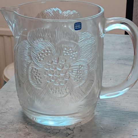Lasinen kristallikannu 1900-luvun alkua. Kaiverrettu kaunis kukka/lehtiboordi ylhäällä. Korkeus 16cm. Halk.ylh. 11cm, alt.13cm. Erittäin hieno lasikannu. n. 1,4 litr. Ei säröjä