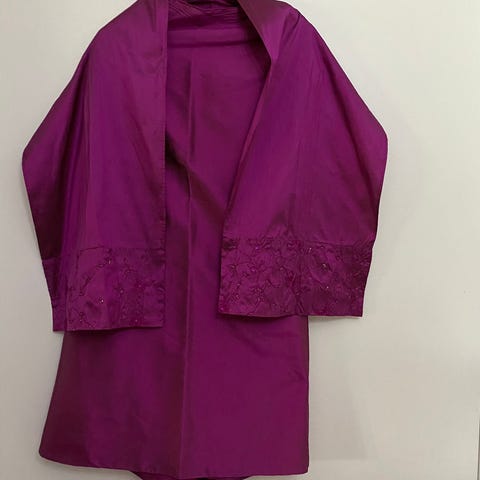 Tazzian juhlamekko ja -jakku, koko S (36). Mittoja: kainalosta alas helmaan 126 cm, edestä 131 cm, vyötärö 72 cm, hihan pituus jakussa 14 cm, jakun pituus takaa 39 cm.