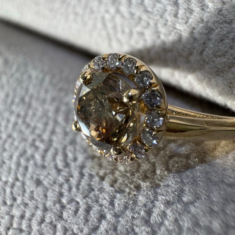 Todella kaunis, erikoinen timanttisormus, joka hiukan Versace-tyylinen timantin istutuksen ja muodon vuoksi. Hyvä käyttösormus, timantissa, n. 0,20 ct, tukeva istutus. Koko sormuksessa n. 16,5. Valkokultaa, paino 5 g. Sormus ostettu kultaliikkeestä ulkomailta, arvioitettu aitous gemmologilla Suomessa, joka todensi timantin, kullan aitouden yms. Ei kirjallista dokumenttia kuitenkaan. Timantin väri, puhtaus ei ole jäänyt mieleen, mutta vaikka ei mikään Top Wesselton, sormus on graafisen tyylikäs ja kivi kimaltelee kauniisti.