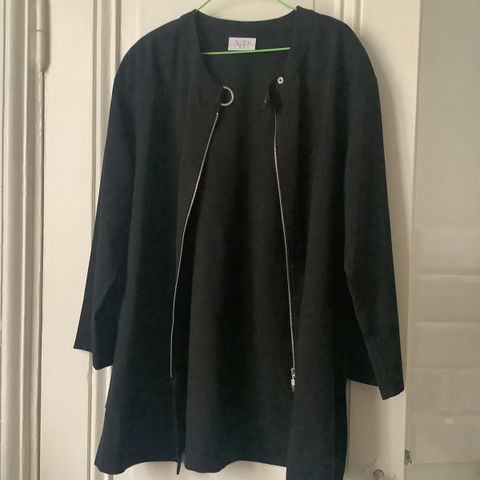 Jakku, pitkä, musta, NP+, suuri koko 40, kainalo- kainalo noin 58 cm, jakun pituus 80 cm, edessä pitkä vetoketju, suuret päälitaskut.