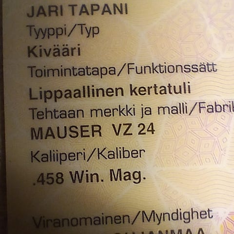 Myydään hyvä kuntoinen suurriista ase Parker&Hale Finnhunter Safari .375 h&h. Made in England, huippulaatua. Kääntöpikajalat kiikarille mukaan 1"/26mm ja 30mm, kiikari ei kuulu kauppaan. Mauser lukkoinen pakkosyötöllä, kiinteä lipas. Mukaan myös panoksia, latausholkit, hylsyjä ja luoteja. Hienot kaiverrukset lukkorungossa.