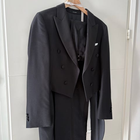 Vanhemman malliston frakki. Koko hyvä n. 170cm hoikalla. Takki hartia n. 46cm. Housut sivupitius n. 108cm. Vyötärö 80cm. Kengät 43.Kuvassa nopeasti puettu vain, löytyy napit, taskuliina, hanskat. Sovitus mahdollisuus 25370 Pertteli, maksetaan noudettaessa, henkilötiedot tarkistetaan.