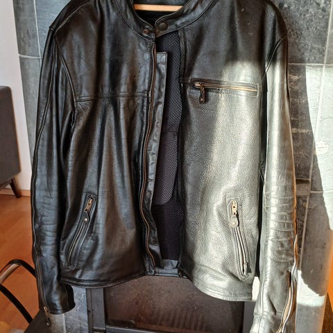 Vähällä käytöllä ollut nahkatakki, missä kevyt kiinteä vuori. Sopii kevät/kesä/syksy käyttöön. Suojat selässä, olkapäissä ja kyynärpäissä. Kaksi taskua sisäpuolella ja kaksi ulkona. Vahvat vetoketjut edessä ja ranteissa. Istuvuus suojien kanssa tosi hyvä ja koko ennemmin S vaikka takki on XS. Kunto oikein hyvä ja kulumaa ei ole näkyvissä.