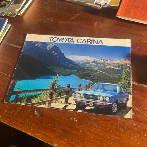 Myytävänä kuvassa oleva Toyota Carina 16-sivuinen automyyntiesite, jossa yksi sivu teknisiä tietoja; Suomenkielinen.