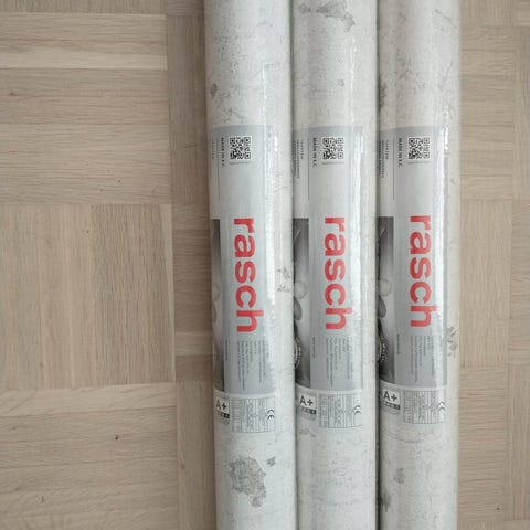 Kaksi uutta rullaa kuitukangastapettia (non-woven), yhteensä reilu 10 m2. Merkki Rasch.