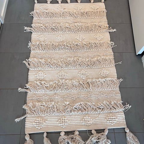 Uusi harmaa matto hapsuilla, kevyt ja melko harvasti kudottu.