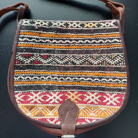 Bozzini-merkkinen nahkainen olkalaukku. Pitkät olkahihnat ovat parhaat päivänsä nähneet, muuten hyväkuntoinen punottu nahkaolkalaukku (pieni kantohihna ihan ok, pituus n. 44 cm). Hopean värisellä nahkamaalilla saa olkahihnat aika hienosti uudistettua. Ostettu v. 2007 tai 2008 SiljaLinen laivalta Ruotsin reissulla.. Laukun pituus on n. 36,5 cm ja leveys n. 40 cm. Ulkopuolella kaksi suhteellisen syvää vetoketjulla suljettavaa taskua ja sisäpuolella 2 penehkköä avointa sivutaskua ja yksi vetoketjulla suljettava isompi sivutasku. Vuori on hopeanvärinen. Laukku on pitkiä olkahihnoja lukuunottamatta hyväkuntoinen.