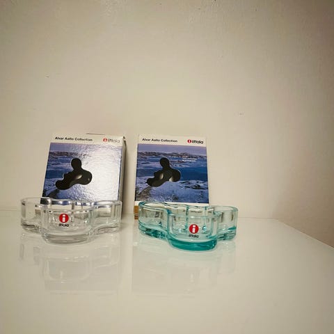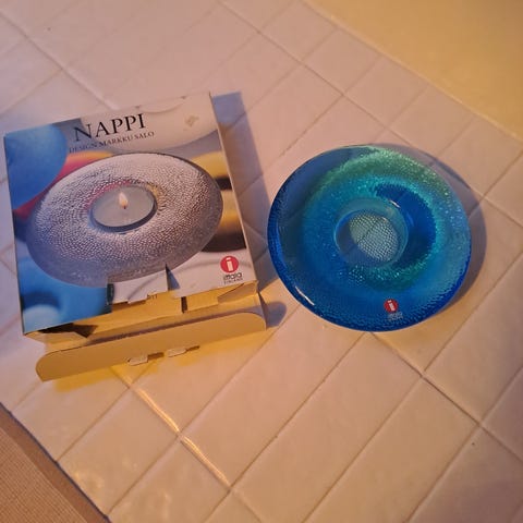 Myydään Iittala Nappi kynttilälyhty, vaalean sininen, halkaisija 12cm, korkeus 2cm.