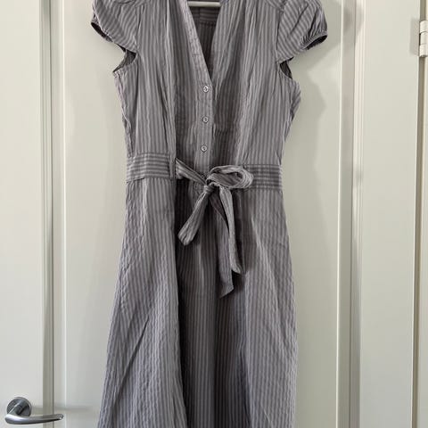 koko on 38,väri vaalea harmaa/valkeat pilkut,edessä napit vyötärölle asti,sivuilla taskut,kuminauha vyötäröllä,kapea vyö,