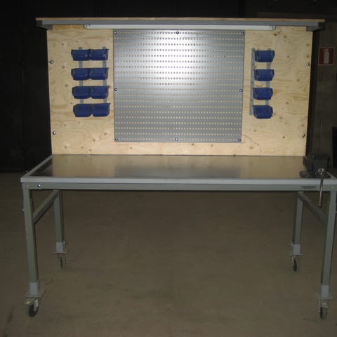 3 teetettyä metallikehikkoista tukevaa työpöytää pyörillä,pöydissä kaksi tasoa 20mm vesivaneria jotka saa pois nostettua