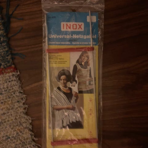 Pitkä virkkuukoukku ja haarukka pitsi laite