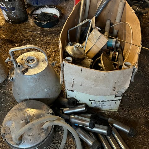 DeLaval lypsykoneen putket 52mm ,kiskot , maidonkokooja ja maitopumppu hanoja ja sähköjohtoja. Lisäksi DeLavalin lantakoneen kiskoja 3kpl n. 3m palat ja 5 jatkopalaa. Löytyy vielä väkirehunjakokärry, kääntyvistä pyörista mennyt laakerit. Lisäksi muutama taulu.
