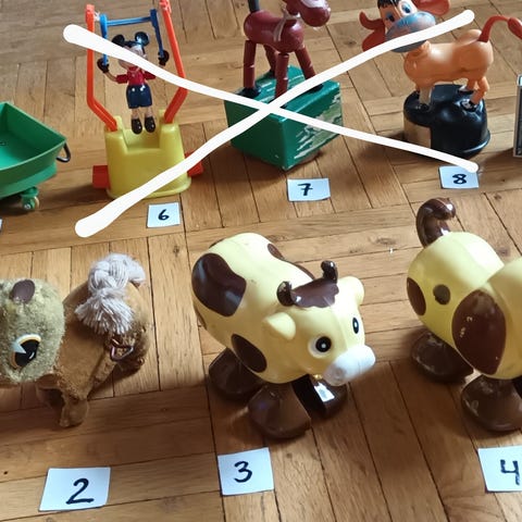 Kummassakin kuvassa ovat siis samat lelut eri näkökulmasta. Litran maitotölkki antamassa mittakaavaa. Jos tarvitset tarkemmat mitat ja parempia kuvia, pyydä ne.