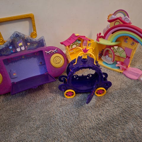 Kuvan siistit ja ehjät ponit ja ponitalli/kuljetuskassi jne.