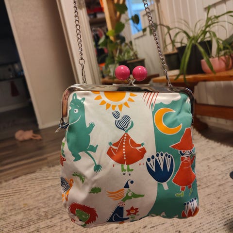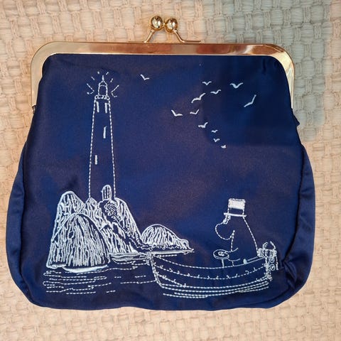 Etupuolella on muumi ja majakka lankakirjonnalla