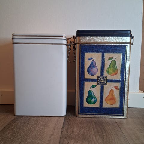 Peppar & Kardemumma vintage peltirasiat, koko 9x6x6 cm. Kulumaa on ja sisältä tummunut.