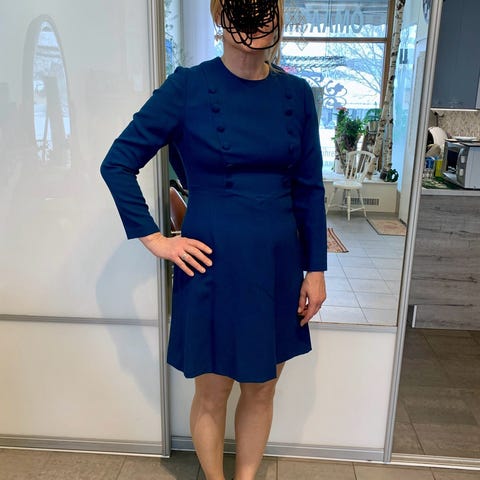 Sisälahkeen pituus 77 cm, lahkeen yksi sivu 30 cm, vyötärökappaleen takaosan leveys sivusuuntaan kapeimmillaan 41 cm. Housujen kokonaispituus 119 cm. Taitava ompelija vaikka kaventaa lahkeet mieleisekseen.