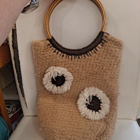 Pellavanvärinen kassi, kiva paljettikoristeinen kuva. Mitat 28 x 31 x 13,5 cm. Siistikuntoinen.