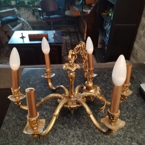 Hieno kattokruunu, halkaisija noin 60 cm. Yhdessä kuvussa lohkeama, kts kuva.