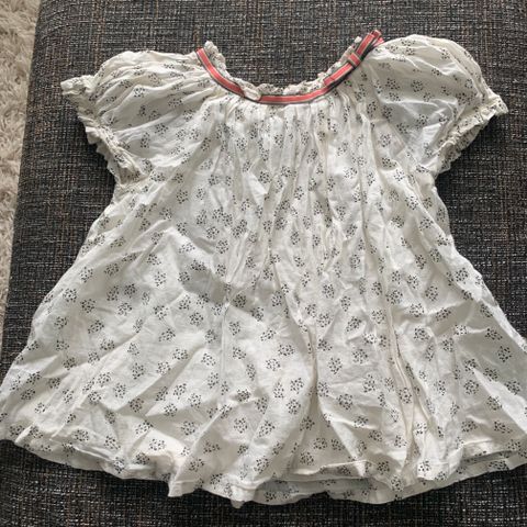 Tummansininen neuletunika, jossa selässä napit ja helmassa röyhelö ja rusetti. Kimallelankaa resoreissa. Koko 110/116 cm.