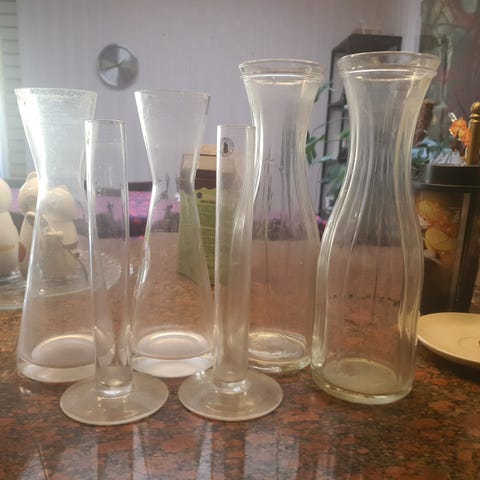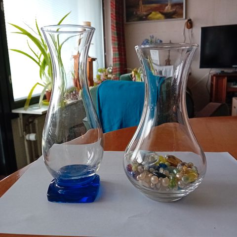Myyn kuvassa olevat kaksi maljakkoa ja kolme esim tuikuille sopivaa maljaa. Kaikki erinomaisessa kunnossa. Olleet vitriinissä koriste-esineinä. Kaikki yhteensä maksavat 15 euroa. Isommat yksitellen maksavat 10 euroa kpl ja kolme pienintä yhteensä 6 euroa. Korkeimman maljakon korkeus on 19 cm ja halkaisija 6,5 cm. Toiseksi suurimman korkeus on 12 cm ja aukko 9 cm.
