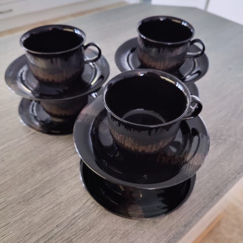 3 kpl kuppeja aluslautasineen, kahdessa aluslautasessa pieniä käytönjälkiä, ja 2 kpl pullalautasia, molemmissa pieniä käytönjälkiä. Kupin korkeus 6,5 cm, halkaisija 9 cm, aluslautasen halkaisija 16,5 cm ja pullalautasen halkaisija 21 cm. Nouto. Hinta yht. 70 euroa.