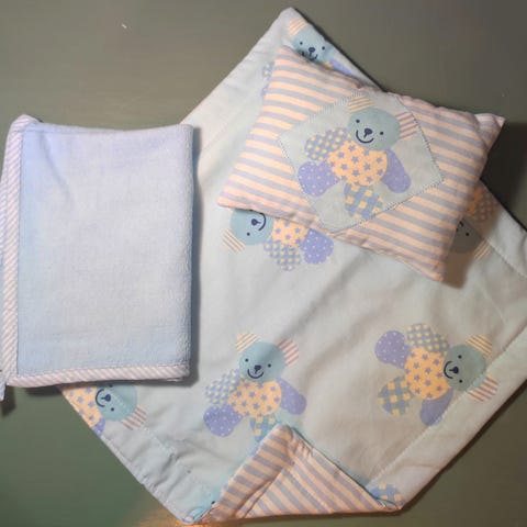Myydään kaunis tilkullinen nukkevauvan peitto. Toiselta puolelta yksivärinen. Koko 63×41,5cm