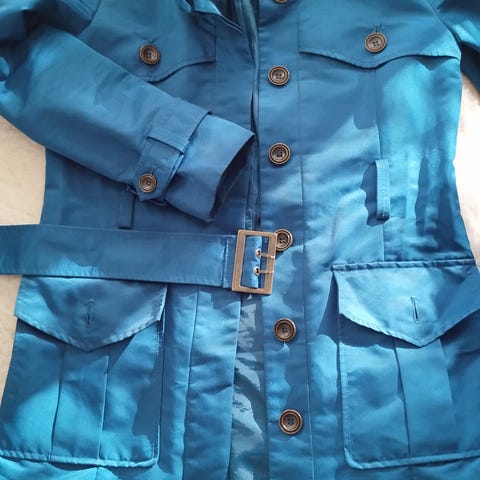 Kuvan upea turkoosi pusakka. Hioissa näyttävät nappiyksityiskohdat. Koko M. Hyvässä kunnossa. Konepesu.